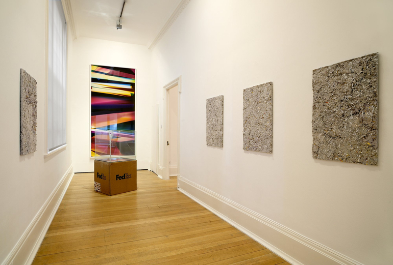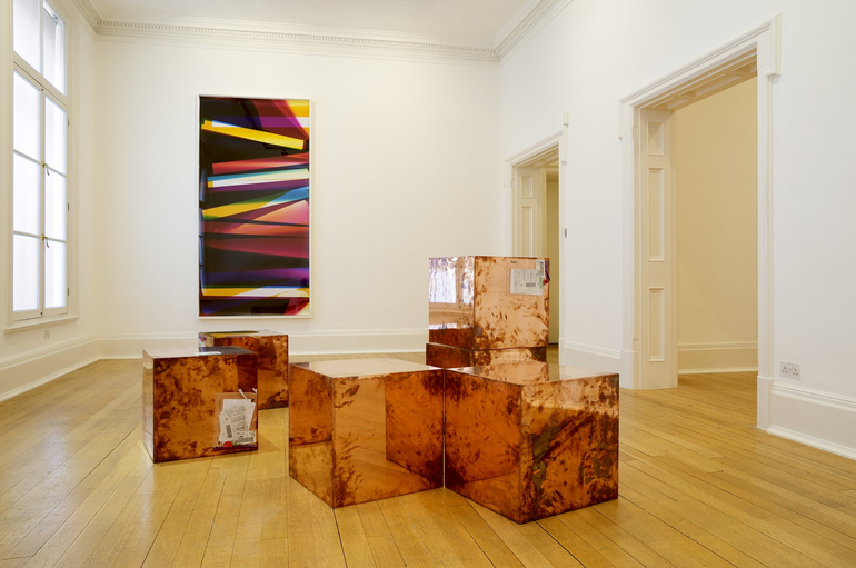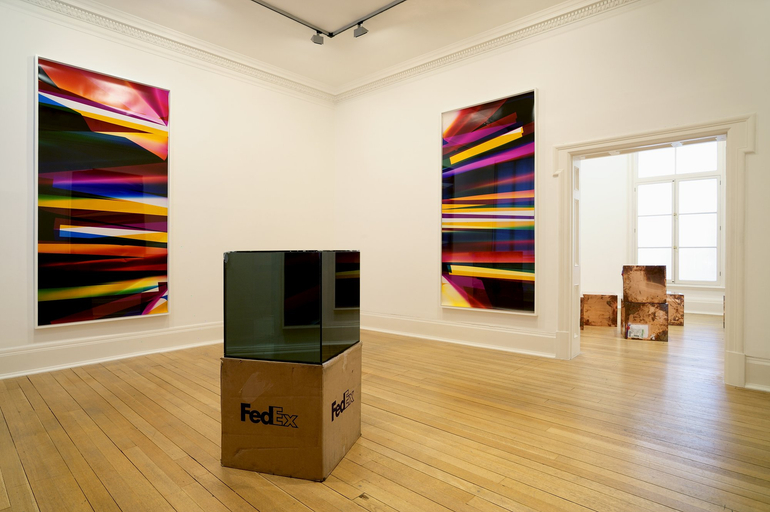 Thomas Dane Gallery is pleased to announce the first London exhibition of LA-based artist Walead Beshty. Beshty's photograms and sculptures explore the nature of both the production and consumption of contemporary art. Only giving aesthetic sensibilities the briefest attention, Beshty is more preoccupied with how the art is made, and how this is evident in the work itself. His monumental photograms incorporate the camera-less, negative-less photographic process forged by early twentieth century artists Laszlo Moholy-Nagy and Man Ray, who produced their work by placing an object on photosensitive paper before exposing it. In a modern variation, Beshty uses new technologies such as colour processing and large-scale printers, creating unique images by folding, curling and shaping photographic paper and exposing it to different intensities of light. Beshty has also famously left the image-making to chance when he brought photographic paper through x-rays machines at airport security. With a similar concern for subverting the customary systems of art-production and a continuous reflection on commerce, and the production and dissemination of images and objects, Beshty has worked on various series of 'Fedex Sculptures' since 2005. Originally made with shatterproof glass, the sculptures are designed to fit inside a standard FedEx box. Just as the photograms are material representations of the process of their creation, each journey of a FedEx box leaves its memory on the glass; Cracks and impacts all become part of the sculpture. The process of making the sculptures begins in earnest when FedEx is used in lieu of a professional art shippers to transport the work between artists studio and exhibition space. The more recent FedEx boxes on show are made of copper, and shipped unprotected so their physical journey is even more directly recorded on their surface. Walead Beshty was born in London in 1976 and now lives and works in Los Angeles. He completed his MFA at Yale University School of Art in 2002, and his BA Hons at Bard College in New York in 1999. The artist has exhibited widely in the New York and London, including the Tate Britain, London and the Museum of Modern Art, New York, both in 2009. He also exhibited most recently at the Hirshhorn Museum and Sculpture Garden.