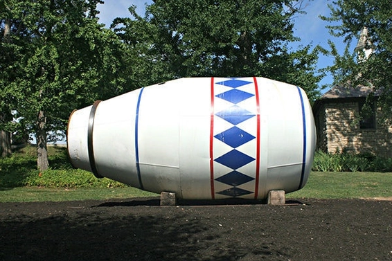Mix (Americana) is installed at Laumeier Sculpture Park in Missouri to mark their 40th anniversary year. It is a full-scale cement mixer, polished and painted in a patriotic red, white and blue. The sculpture has been stripped of its mixing duty on the back of a truck and staged instead as a functional sundial.