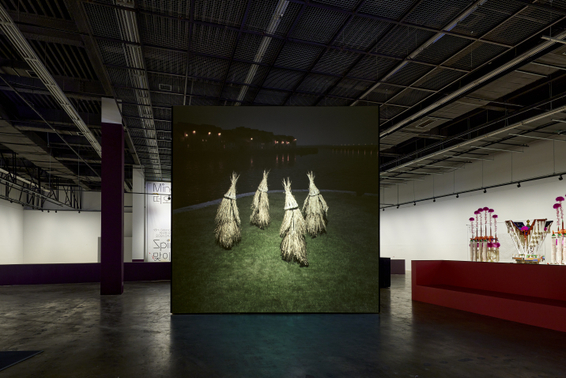 Gerrard’s latest piece, Corn Work (Corrib) (2020) is a simulation projected on a cube cast in polished mirror aluminum that features four Straw Boys, figures drawn from Celtic paganism. Still present in rural areas, these young men wear costumes made of straw and are said to visit brides in advance of weddings, recalling rituals in which anonymized human figures unleash celebratory and often ecstatic behaviors. Gerrard collaborated with contemporary dancers, aged sixteen to seventy, who “performed” and animated these figures in suits made from heirloom Irish grain types that correspond to the annual cycle: barley (spring), oat (summer), rye (autumn), and wheat (winter). Each dancer arrives and leaves in a formal exchange on seasonal solstices and equinoxes, echoing the production of flour through the circular motion of the mills as well as an early sun symbol, the solar cross. Through novel forms of technology like motion matching and neural networks, both time and space are captured as data, and a perpetual choreography is produced. In the backdrop, the landscape follows the temporal cycles of Galway, Ireland—where the work was initially presented as a site-specific commission—and the flow of the river Corrib against the rise and fall of daily and annual temperatures.